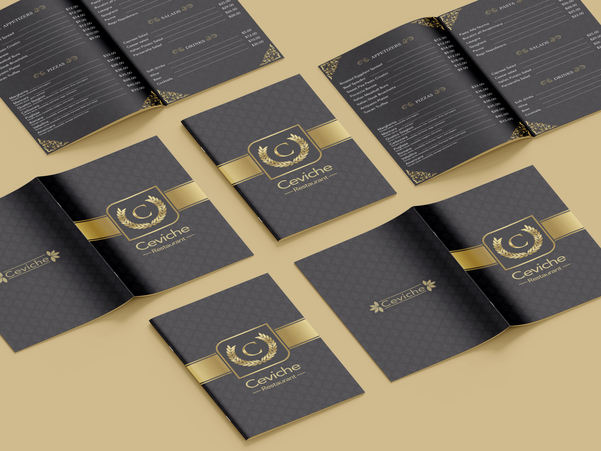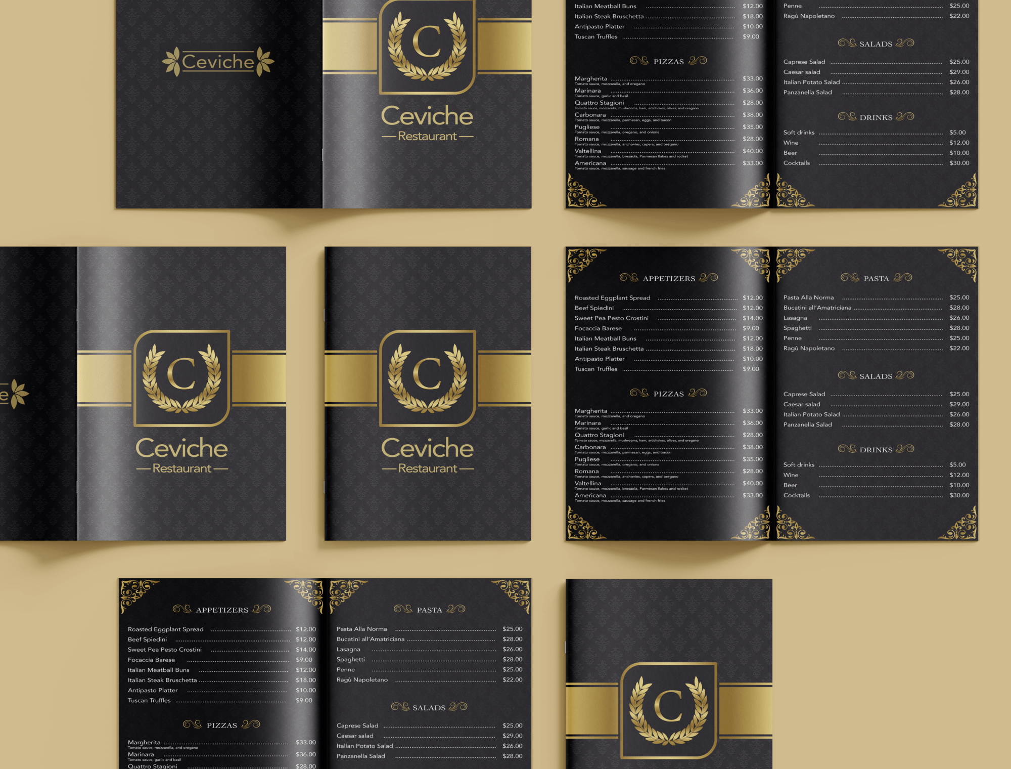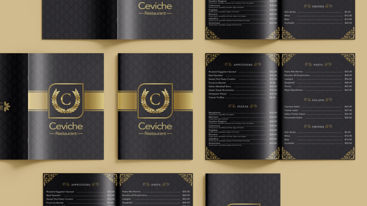 Dive into the artfully crafted menu design for CEVICHE Restaurant. Each page is a visual feast, blending vibrant colors and exquisite typography to elevate the dining experience. Meticulously designed to showcase the diverse and mouthwatering offerings, this menu is a harmonious fusion of aesthetics and culinary delight. Explore the culinary journey that awaits you at CEVICHE below: